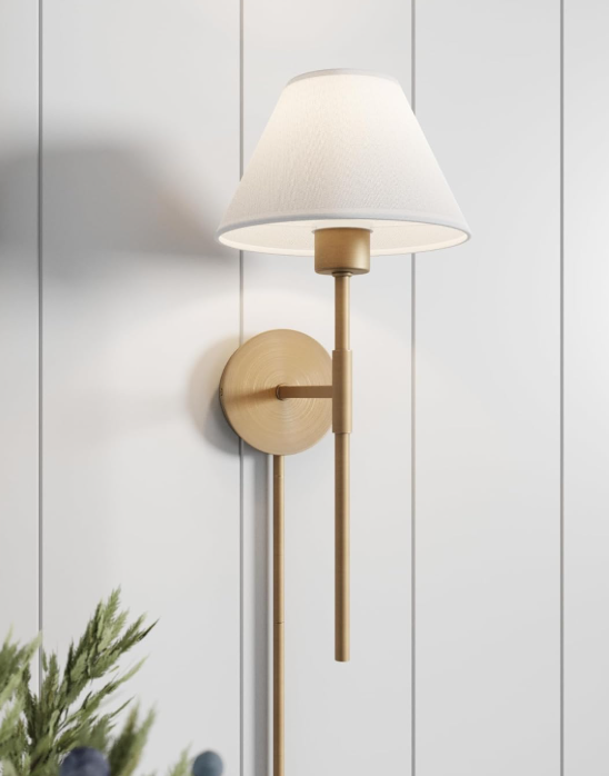 Nathan James Millie Plug-in Wall Sconce, Wall Mounted Bedside Reading Lamp with Cotton Shade and Brass Back Plate, Set of 2