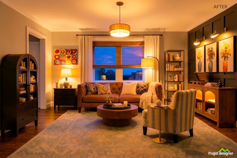 Instead of relying on a single overhead light, we added multiple light sources throughout the room. The ceiling fixture provides general light, while the table lamp, floor lamp, and wall lights each add their own glow.