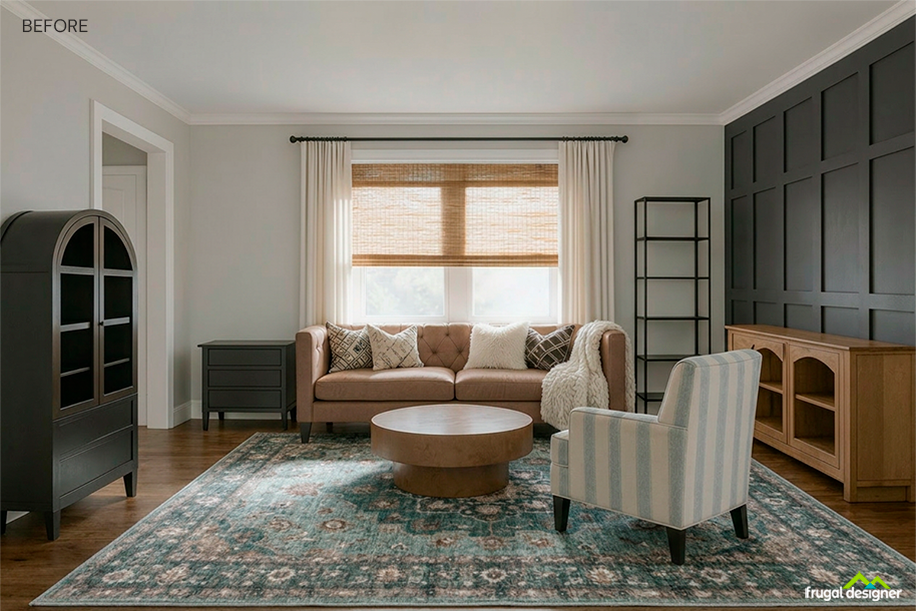 We repeated patterns across the room so your eye naturally moves from one area to another. The three vase prints create a clear repetition, while the patterned pillows carry that detail across the seating area.